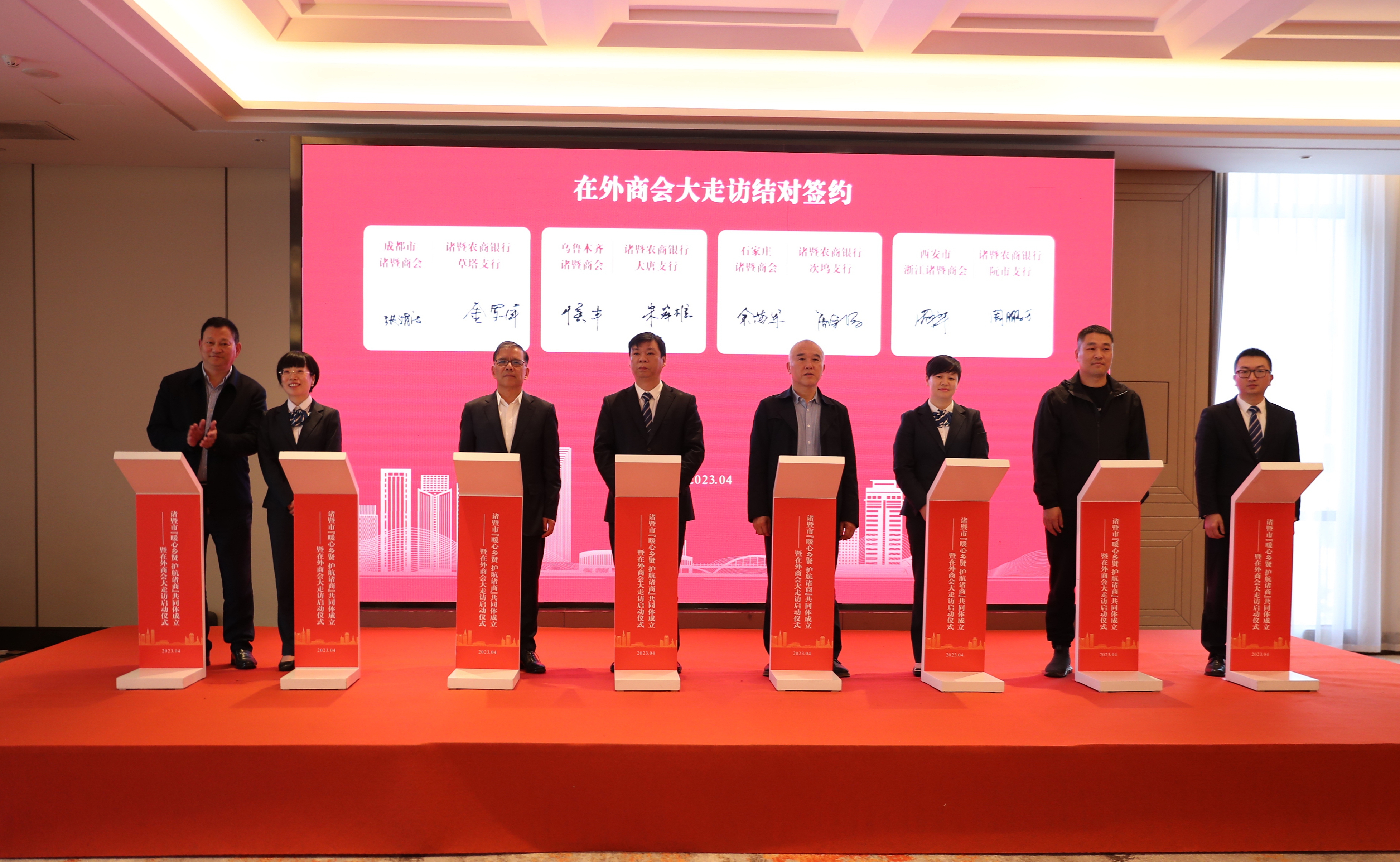 楼闯、吴智晖、詹坚均及杭州市诸暨商会会长李国光、呼和浩特市诸暨商会会长何国贤、北京诸暨企业商会会长郦可锋代表在外商会,共同启动诸暨市“暖心乡贤护航诸商”共同体成立暨在外商会大走访活动。